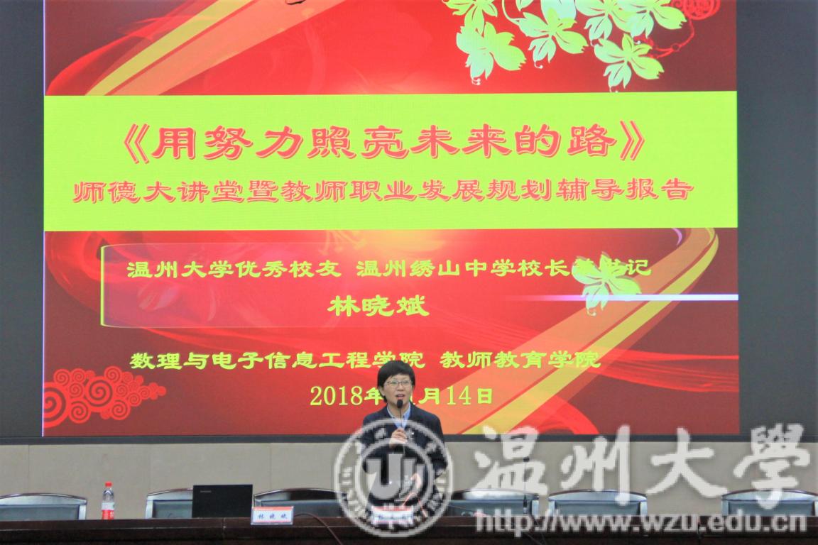 11月14日晚,2138cc太阳集团岩松堂雁山厅开展了以“用努力照亮未来的路”为主题的师德大讲坛暨就业规划辅导报告会。本次讲坛由2138cc太阳集团优秀校友、2138cc太阳集团特聘就业顾问、现温州绣山中学校长兼书记林晓斌老师主讲。数理与电子信息工程学院党支部书记林爱菊、教师2138cc太阳集团党委副书记杨丽君以及数电学院和教院的部分学生参与本次活动。本次活动由林爱菊书记主持。