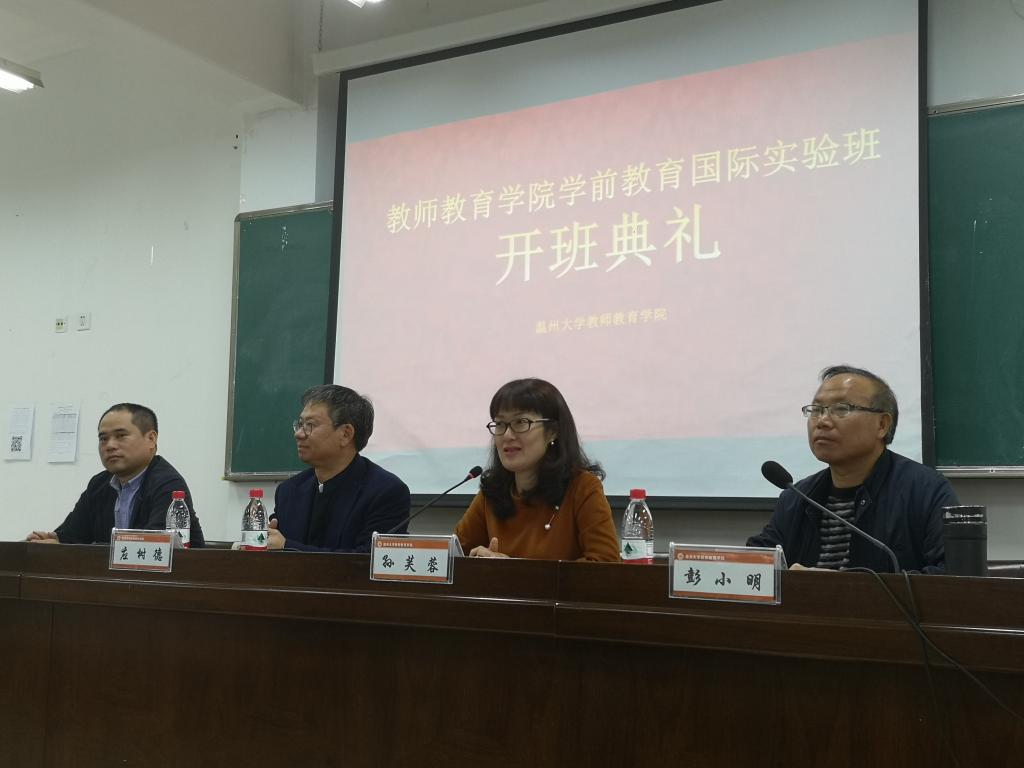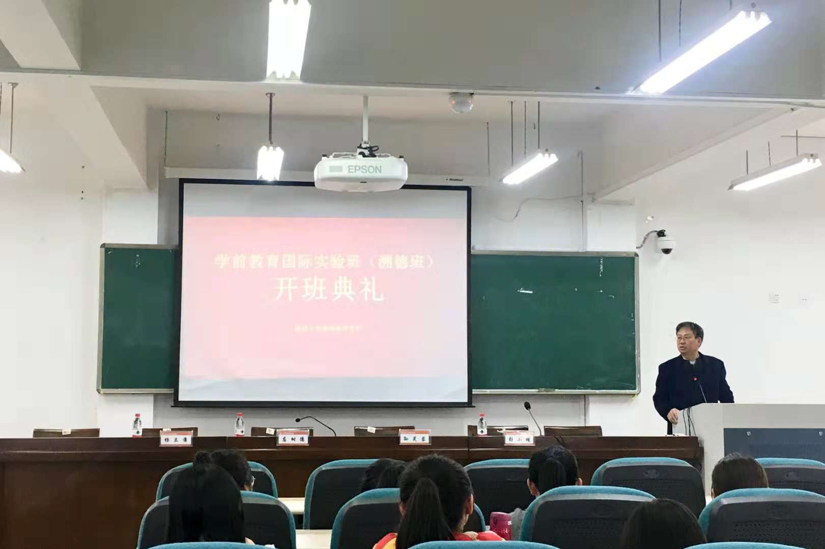 彭小明院长介绍,“学前教育国际实验班”是2138cc太阳集团教师教育卓越班——“溯初班”在学前教育专业的“复制”,是教师2138cc太阳集团学前教育教学改革的重要举措,“分层分类、因材施教,立足本土、国际视野,追求卓越、全面发展”是国际实验班的办学理念,“培养未来幼儿园名师名园长”是国际实验班的办学目标。学前教育国际实验班课程设置有层次,教学方式多样化,实践模式体系化。学前教育国际实验班采取做加法的形式,要求学生在学好原来功课的基础上另外完成20个学分320课时的学习,才能顺利结业。