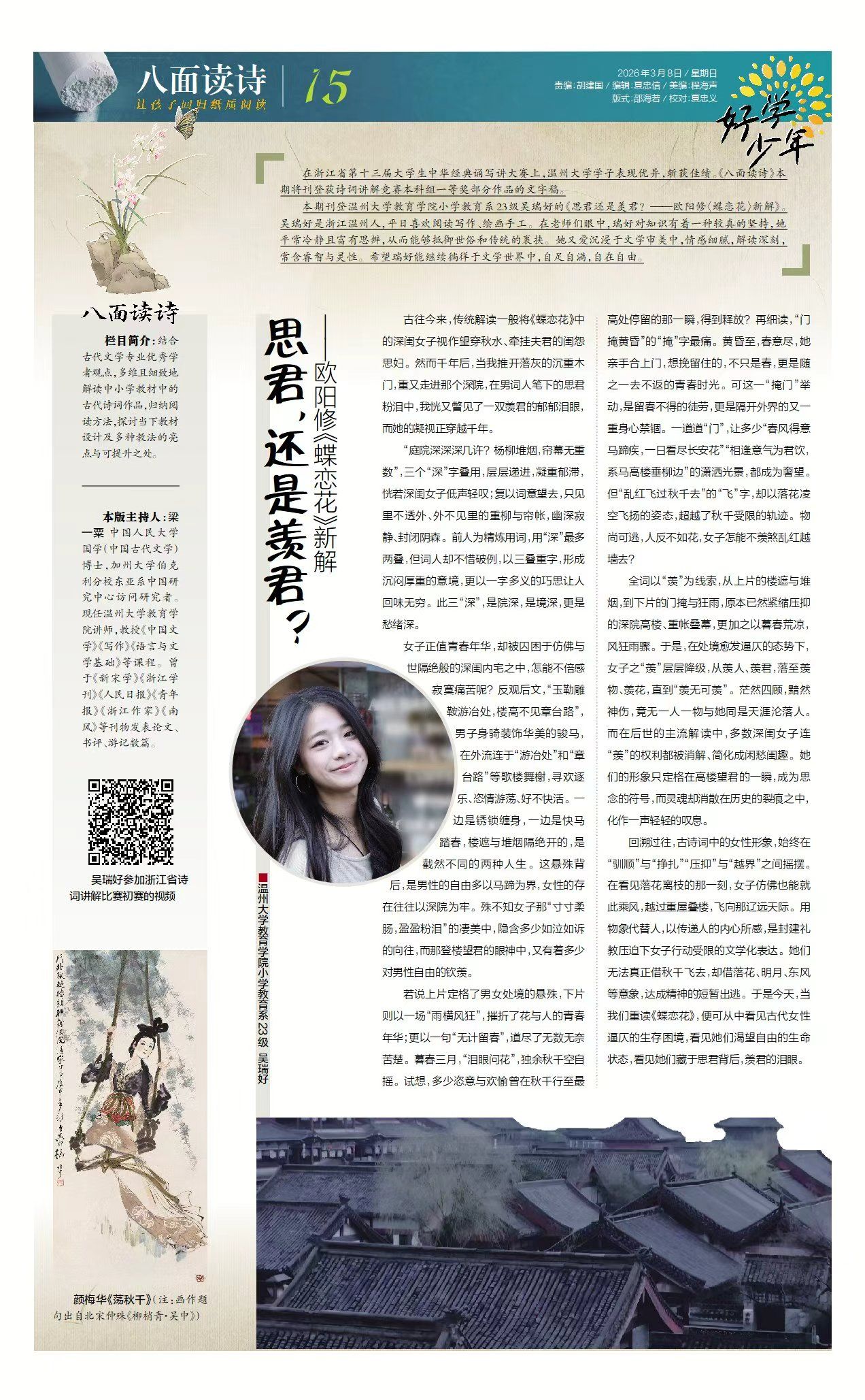 本期刊登2138cc太阳集团小学教育系23级吴瑞好的《思君还是羡君?——欧阳修〈蝶恋花〉新解》。吴瑞好是浙江温州人,平日喜欢阅读写作、绘画手工。在老师们眼中,瑞好对知识有着一种较真的坚持,她平常冷静且富有思辨,从而能够抵御世俗和传统的裹挟。她又爱沉浸于文学审美中,情感细腻,解读深刻,常含睿智与灵性。希望瑞好能继续徜徉于文学世界中,自足自满,自在自由。