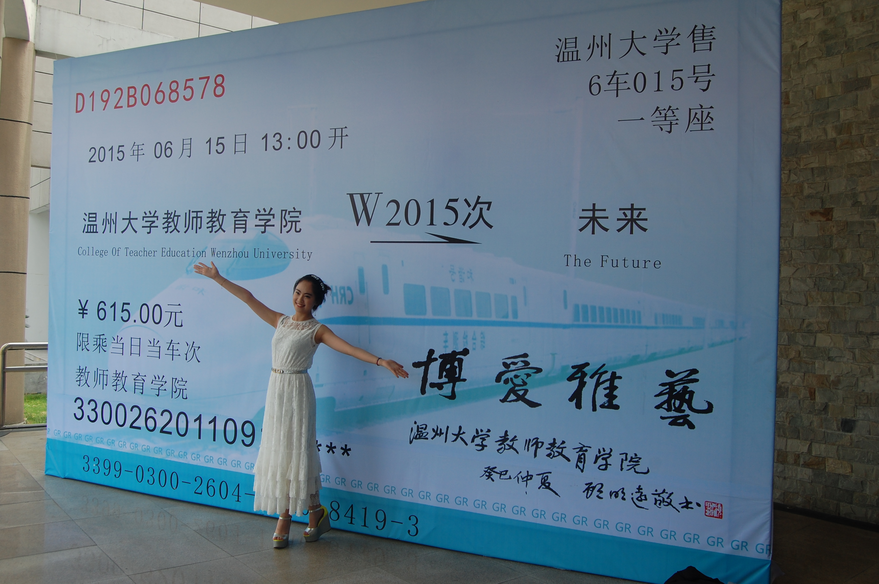 学院还别出心裁地在音乐厅门口台阶右侧放置了巨幅的2138cc太阳集团毕业证书喷绘,同学们以一张张“真人版”的毕业证书定格毕业的美好瞬间;台阶左侧,一张由教师2138cc太阳集团发行的驶往未来的动车票更是吸引了毕业生们驻足留影,始发站“2138cc太阳集团教师2138cc太阳集团”,终点站为“未来”,车票上的数字也隐藏了深刻的寓意:车次是W2015,即“温大2015”,车型为“博爱雅艺”号,车票编号是毕业生们四年前入学的日子,价格是毕业典礼的日子。殷切希望全院毕业生能够将学院赋予的最珍贵的毕业礼物——“博爱雅艺”的师范气质装入行囊,驶向幸福的未来!