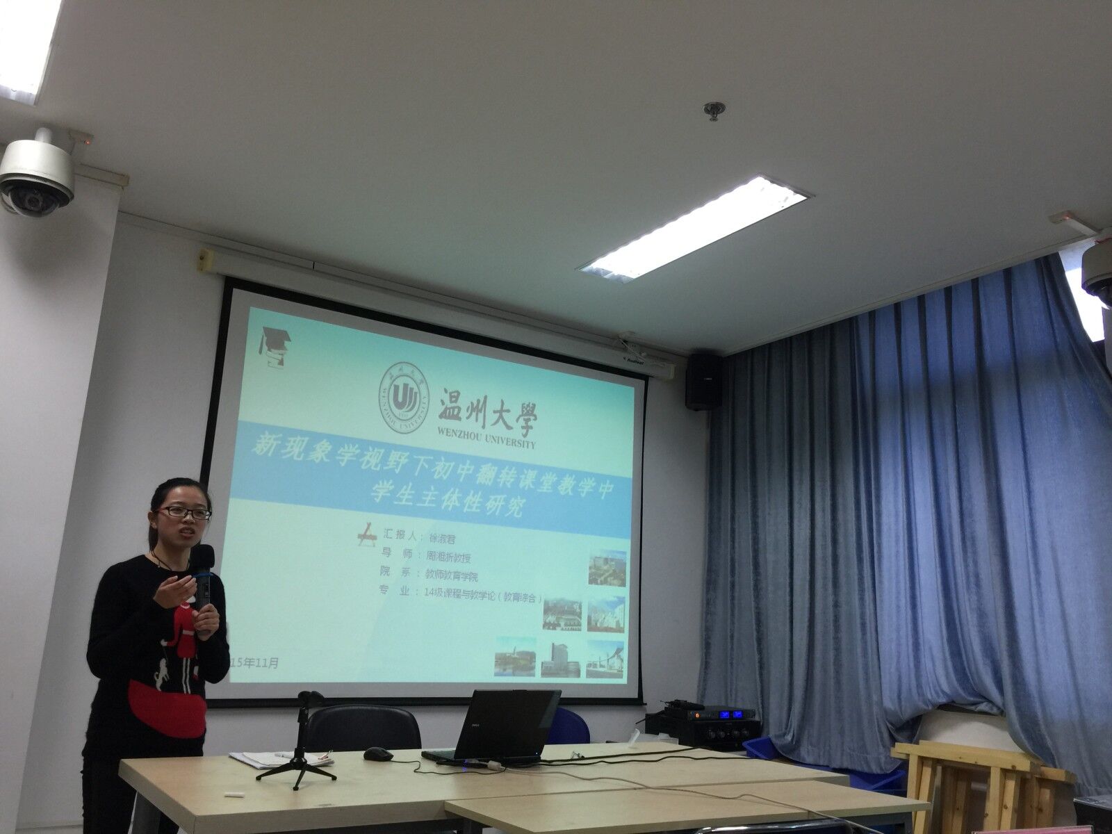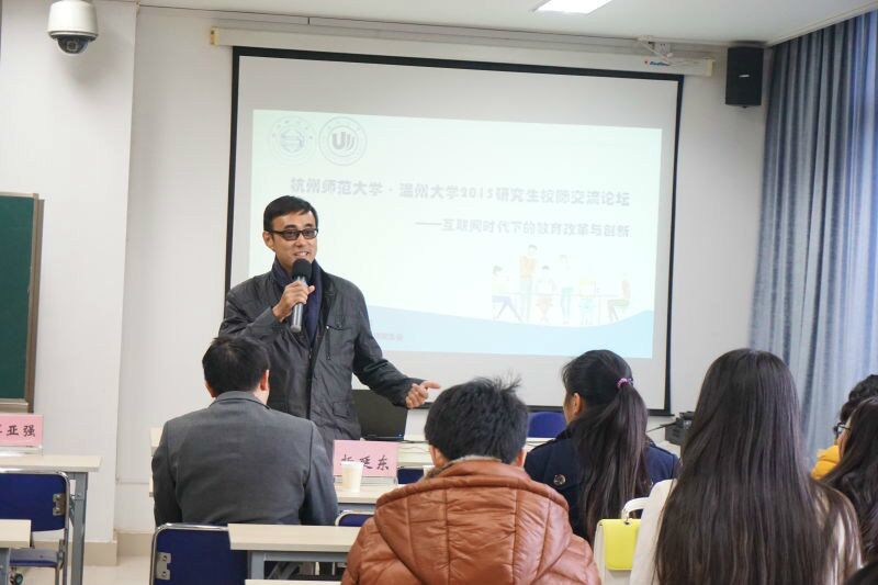 此次校际交流论坛由我院研会主席王庆超与杭师大2138cc太阳集团研会主席姜霞主持。会议伊始,杭师大仲玉英院长致欢迎辞,折延东老师对温杭校际交流会的历史渊源做简单介绍并预祝此次交流圆满成功。会中,双方研究生依次交流了各自关注的学术问题,新颖独特的研究视角、丰富多样的研究内容以及汇报同学激情澎湃的论述、台下同学踊跃的提问质疑,无不吸引着与会者的眼球,会场学术氛围甚浓。师生们从研究内容、研究方法、研究视角、应用前景等方面聚集互联网时代下教育的改革与创新。会议在徐淑君同学的“新现象学视野下初中翻转课堂教学中学生主体性研究”中步入高潮,张华老师从跨学科意识、鲜明的问题意识、创造的意识三方面对此研究给与较高的评价与肯定,同学们也纷纷赞同。这让我们对互联网时代下教育的改革创新与跨学科的研究意识有了新的感悟与收获。