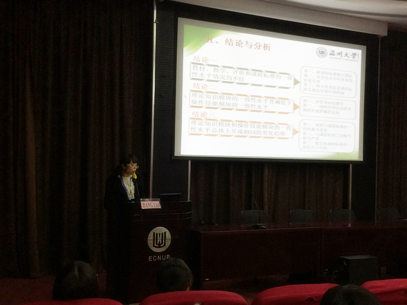 2015年11月6日- 8日,第13届上海国际课程论坛在华东师范大学开幕,我院13级研究生姜丽希同学论文《高中课程标准实施一致性的研究——基于美国SEC一致性分析模式》(论文作者:姜丽希、孙芙蓉、王庆超)入选大会论文集,并受大会邀请做分会场主题发言。