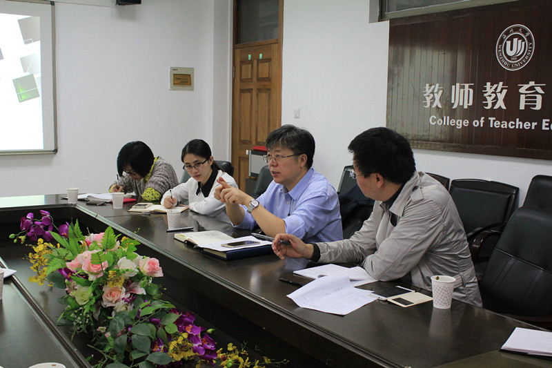 李校堃校长一行首先听取了郑信军院长所作的学院发展情况与未来发展思路的报告。郑院长在汇报中从学院的办学历史、师资队伍建设、科研与专业建设、人才培养、服务基础教育等方面的情况,特别介绍了学院坚持与推进“师范气质”人才培养方略的情况。他总结了学院十二五期间的主要工作及成果,并提到了学院制定十三五规划的基本思路。其他学院领导做补充介绍。杨立淮书记着重就学院师德师风建设和校园文化品牌建设工作做了介绍,潘玉进副院长就学院发展过程中需要学校支持的事项进行了说明,彭小明副院长介绍了由我院承担的省教师教育基地建设及“溯初班”的工作。