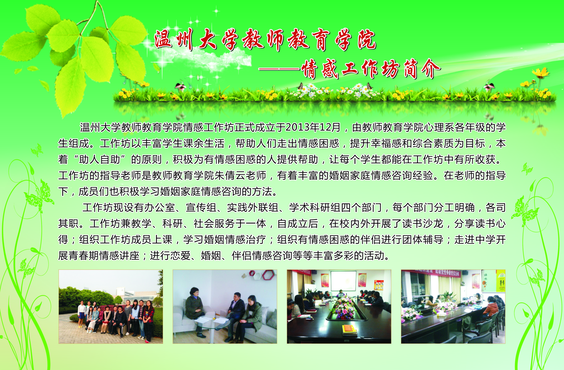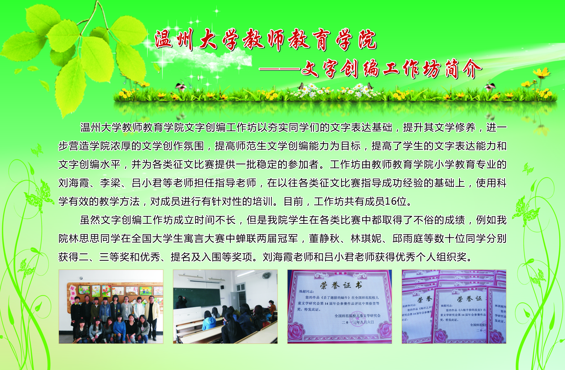 近些年,教师2138cc太阳集团学生工作以培育学生“博、爱、雅、艺”师范气质,深化学院优良学风建设,提升学院服务地方的能力为宗旨,创办了一系列的学生专业工作坊。从09年开创至今,学院工作坊数量逐渐扩大,目前已拥有语言工作坊、儿童剧剧社、书法工作坊、合唱工作坊、新媒体工作坊、软件工作室、摄影摄像工作室、表演唱工作坊、心理测量工作坊、美术工作坊、舞蹈工作坊、文学创编工作坊、情感工作坊等13个学生专业工作坊。为进一步推进我院学风建设,发挥先进典型的示范作用,展示我院师生在“博、爱、雅、艺”方面的精神风貌,我院特举办此次学生专业工作坊宣传展。