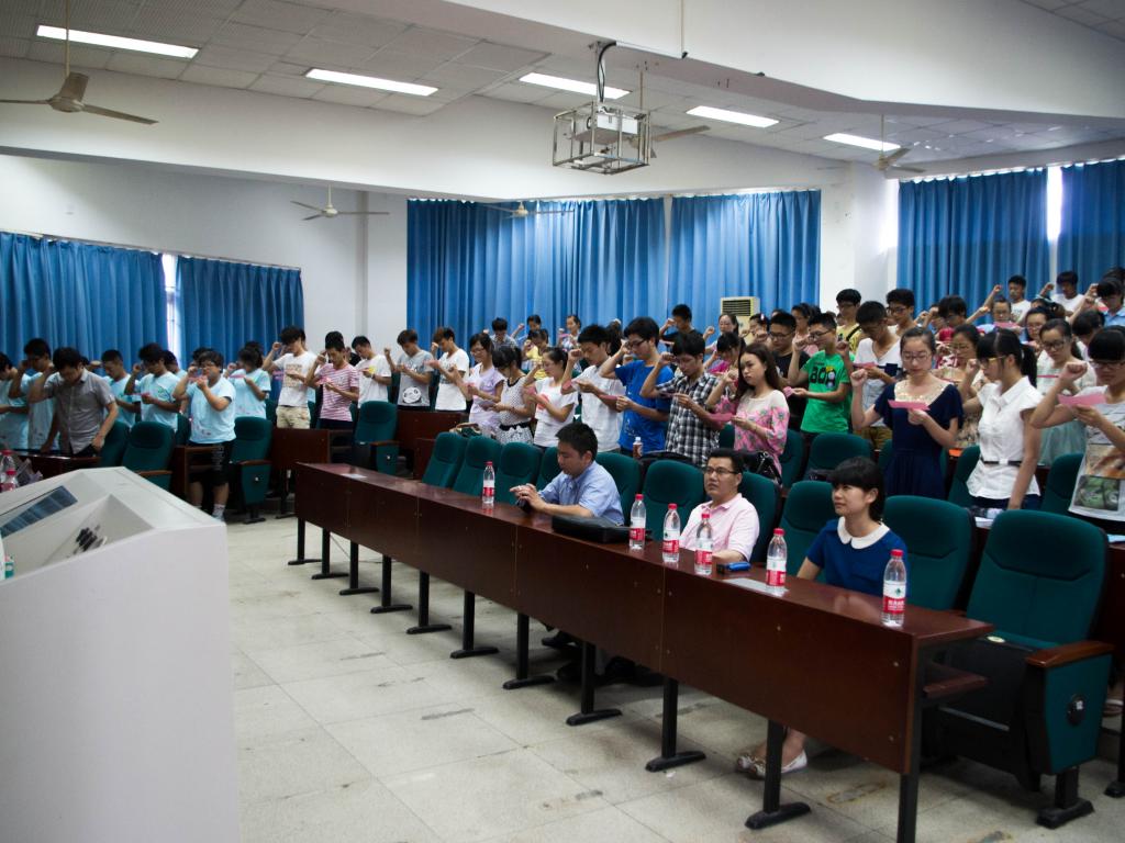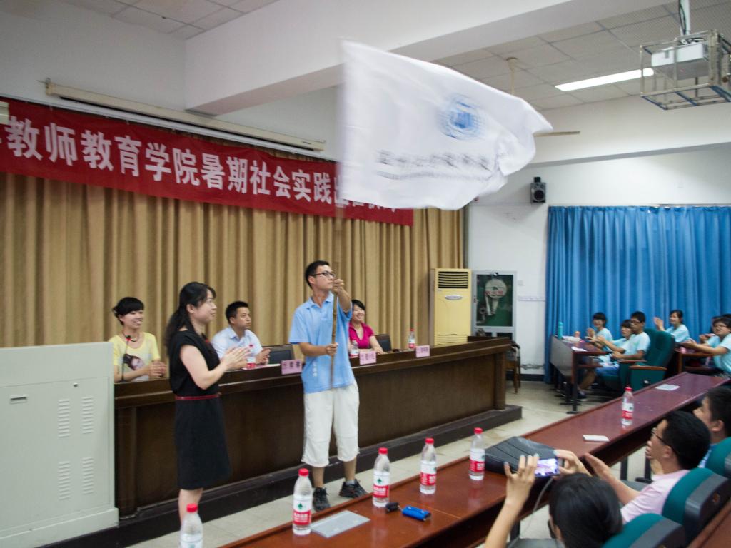 会上来自11应用心理学本的学生代表黄唯佳发言。她表示今年的暑期社会实践在形式和内容上都有所丰富,且每支队伍创新性地开展调研,做到理论和实际相结合。随后来自12小教科学的罗博文同学领誓,全体队员庄严宣誓,铿锵誓词饱含每一位队员的热情和信念。宣誓完毕,由学院党总支副书记嵇小怡为实践总队授旗。高高飘扬的实践队旗,昭示着我院2013年暑期社会实践踏上新征程!