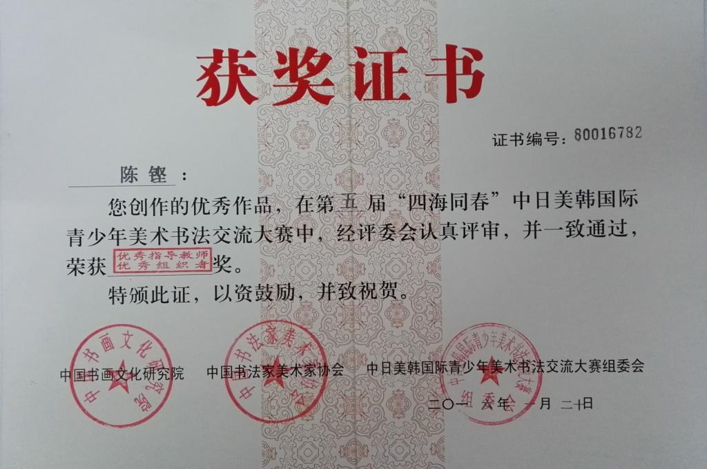 2015年8月,为加强国际间青少年书画的学习与交流,展示广大青少年儿童积极向上、追求美好生活的时代精神,秉承着“提高艺术素养,塑造完美人格”的宗旨,由中国书画文化研究院、日本东京教育文化学院、韩国韩一文化学院、美国中国画院、美国加州圣郡政府艺术委员会等发起主办,中国书法家美术家协会、《中国书画文化报》承办的第五届“四海同春”中日美韩国际青少年美术书法交流大赛拉开了帷幕。