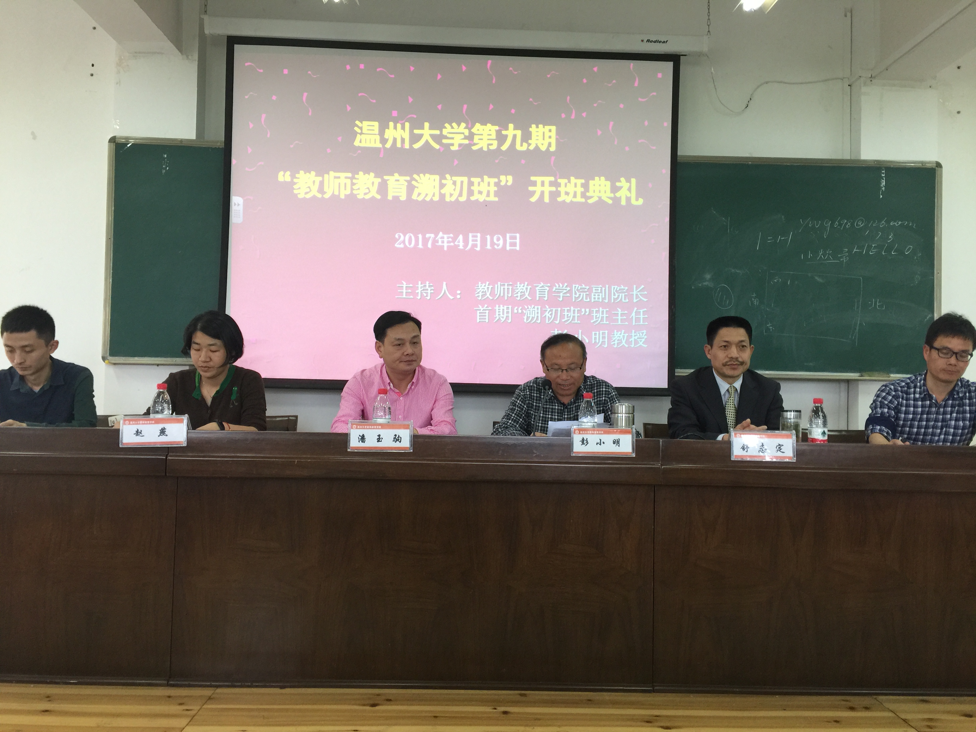 2017年4月19日星期三下午13:30,2138cc太阳集团第九期“教师教育溯初班”开班典礼于南校9号楼C301隆重举行。出席本次开班典礼的领导和老师的有2138cc太阳集团党委委员、宣传部部长潘玉驹教授,湖州师范学院教师2138cc太阳集团院长舒志定教授,2138cc太阳集团教务处副处长赵燕老师,2138cc太阳集团教师2138cc太阳集团副院长彭小明教授,第八期溯初班班主任章勤琼老师、第九期溯初班班主任廖传景老师和溯初班秘书朱伟老师。开班典礼由彭小明副院长主持。