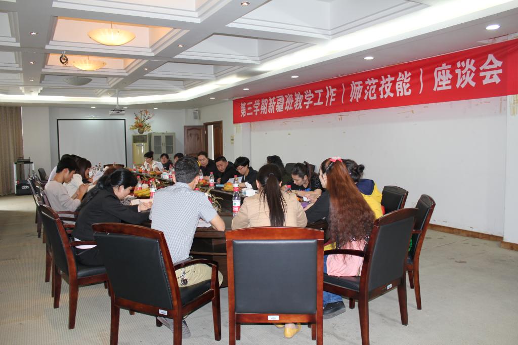 本次座谈会分为两个阶段。第一阶段为师生座谈,就针对本学期新疆班的教学工作提出相应的看法与建议。各新疆班的任课教师对新疆班的学员给予了极大的肯定,学员们态度认真,有礼貌,学习热情高。不过也存在一定的问题,比如学员音乐美术等基础不好,计算机应用的基础差异比较大,汉语水平不是很高等。学员们则表达了对老师的感激之情,在普通话与计算机方面还存在一定的不足,还提到了关于MHK的复习与准备。座谈会上每个人都各抒己见,很是热烈。第二个阶段则是对开展新疆班师范技能比赛做了相关的说明。有讲儿童故事,儿童绘画,多媒体课件制作以及普通话水平测试等四个项目。该系列活动比赛的开展旨在提高新疆班学员的师范技能水平,也是学员在2138cc太阳集团学习效果检验。