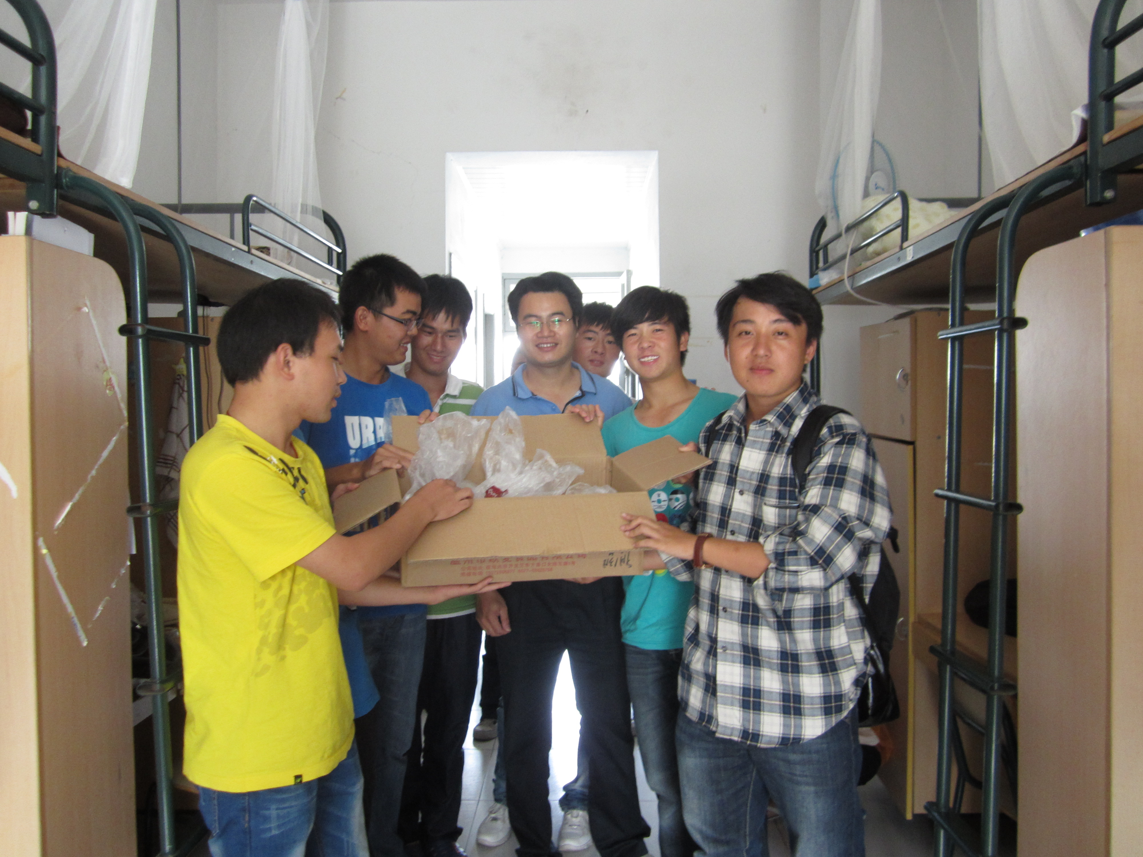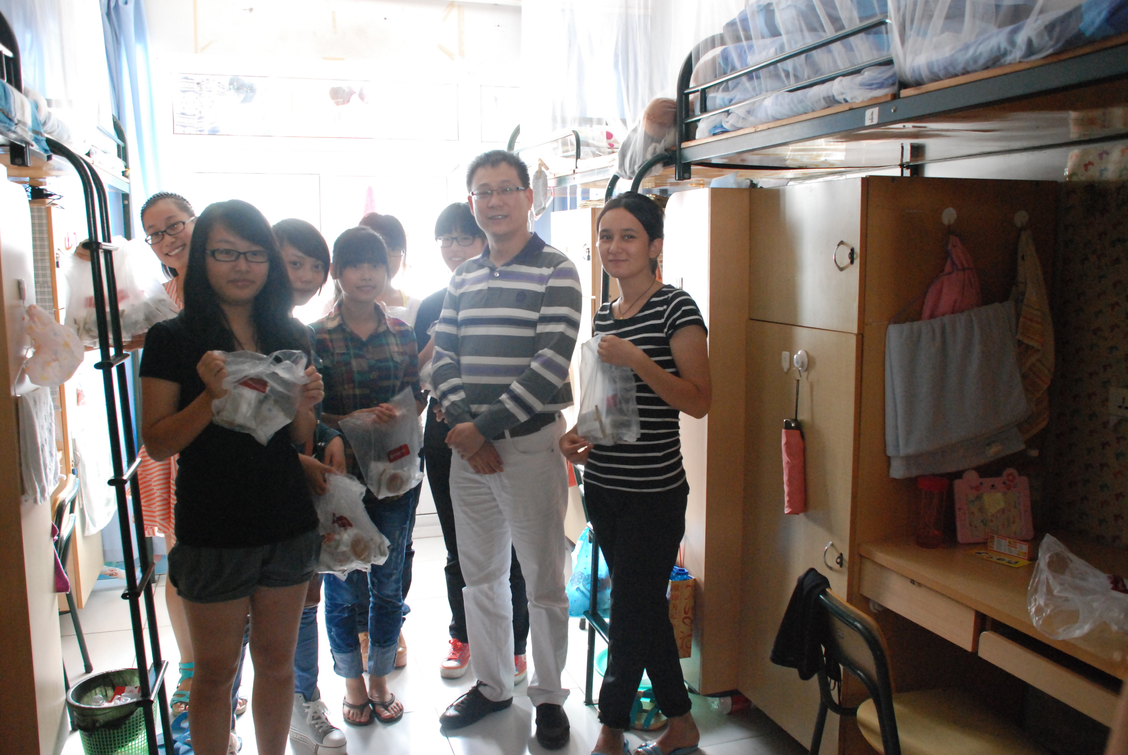 同学们对月饼的期待热情非常高,有些同学还特地中午不去食堂吃午饭,当老师们走进他们寝室的时候,一个同学有趣地说:“没吃午饭,坐等月饼,来了来了,等得我花都谢了。”寝室里立刻充满了笑声和温暖。老师们亲切地慰问了同学们最近的生活和学习情况,并且祝愿大家在这个中秋连国庆的假期中有一个好心情。有些家在外地的同学不能回家,国庆节的长假期就只能在学校留宿,老师们也致以亲切的问候和关心。